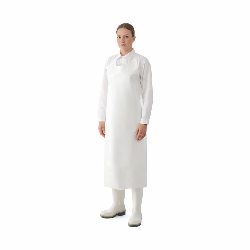 100% poliuretano, esta pechera combina flexibilidad, resistencia a productos químicos y una superficie lisa que facilita la limpieza y desinfección. Su composición sin costuras garantiza mayor durabilidad frente al desgaste diario y a los lavados constantes.